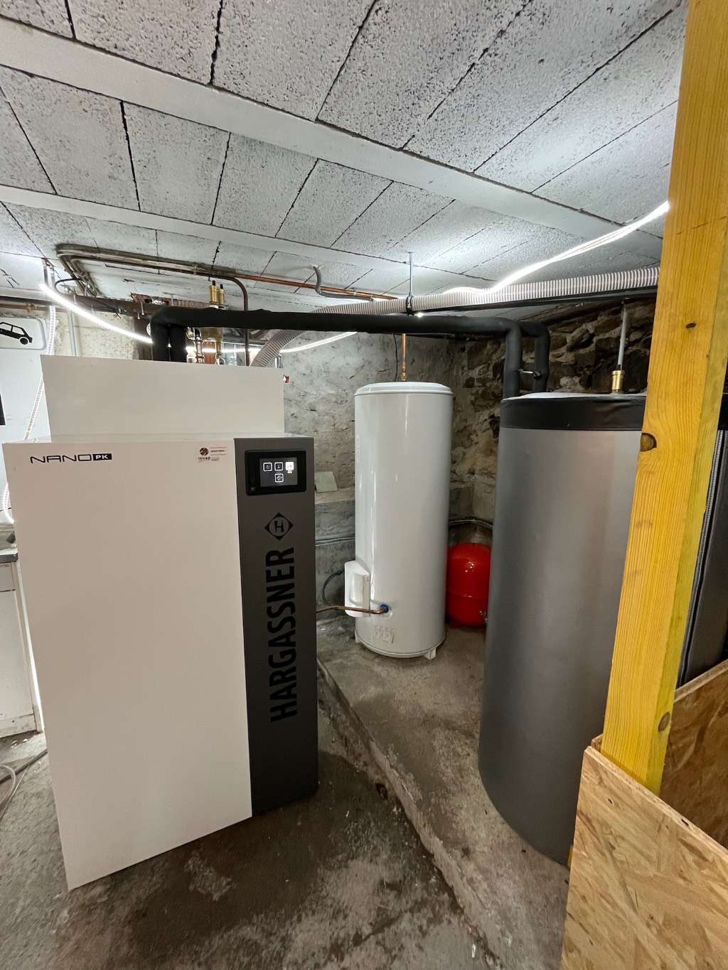 - Installation de la chaudière à granulés Hargassner NANO-PK, couplée à un thermostat intelligent dans la pièce à vivre ;