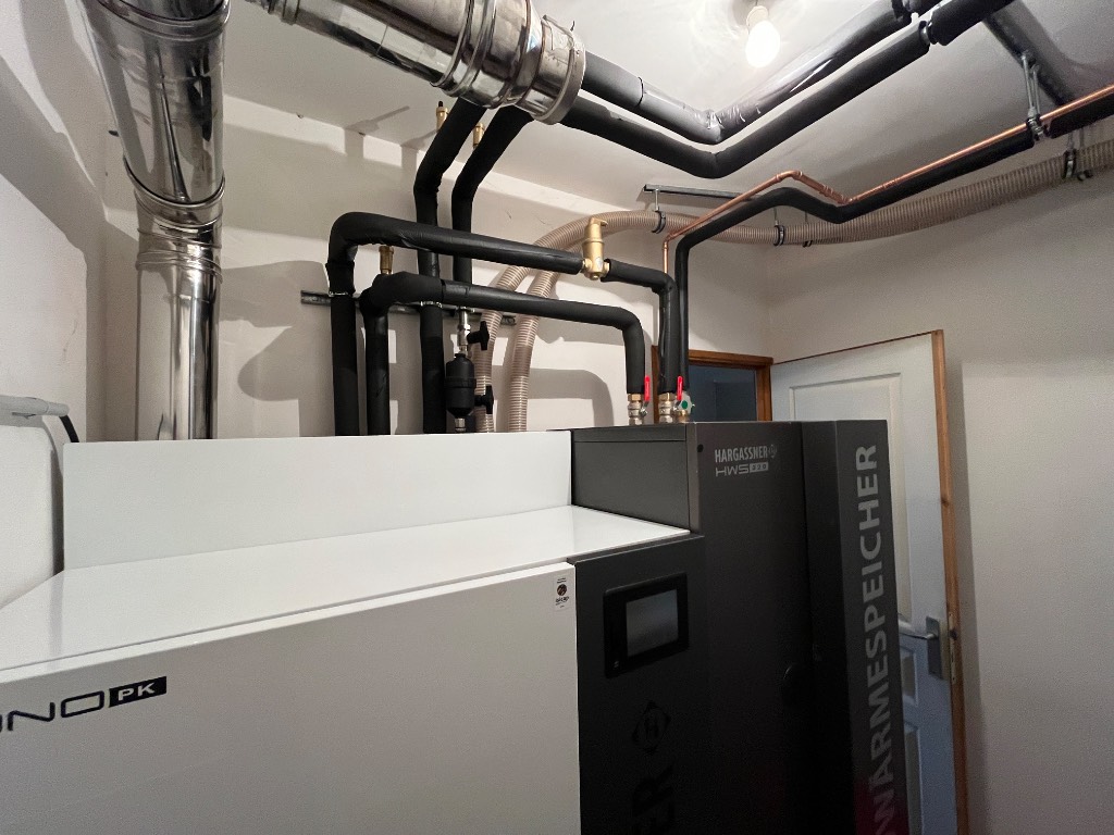 Pour répondre aux contraintes d’espace et aux exigences de performance, nous avons opté pour une chaudière ultra-compacte Hargassner NANO-PK20, associée à un ballon tampon Nano HWS équipé d’une station de production d’eau chaude sanitaire (ECS) via un échangeur à plaques en inox.